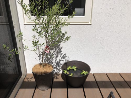 スタッフが水鉢とホテイアオイを用意してくれました。ここに棟梁が育ててるメダカが泳ぐ予定です。