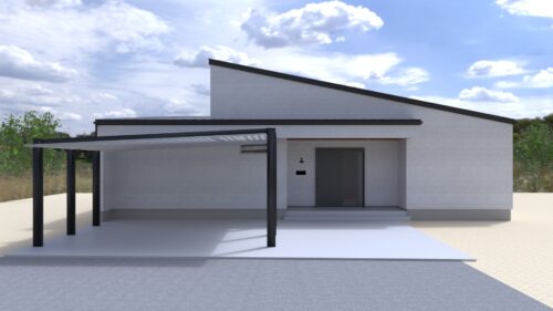 高性能はあたりまえ。デザインにも力を入れています。大きな太陽光が載った片流れの屋根と玄関庇の水平ラインを組み合わせたシンプルで飽きの来ないデザインです。