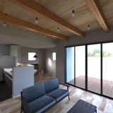 床には長野県産材「あずみの松」を採用。固いフローリングと比較して傷はつきやすいですが、その分足元が冷えません。また、あずみの松や天井に採用している無垢の杉板、梁などは時間の経過とともにあめ色に変化し、味が出てくるため、完成した時が一番の家ではなく、時間をかけてじっくり育っていく家となります。