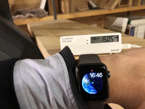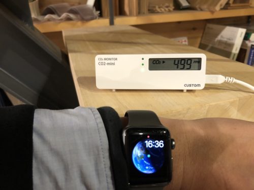 次の写真は、ファンヒーターを焚くとどれくらいCo2濃度が上昇するか実験したところです。