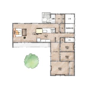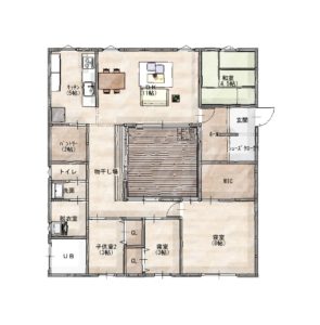 南面する中庭をコの字に部屋で囲んだプランです。デメリットは中庭を大きくすると家自体の面積が大きくなってしまう事と、採光を取りにくいことです。