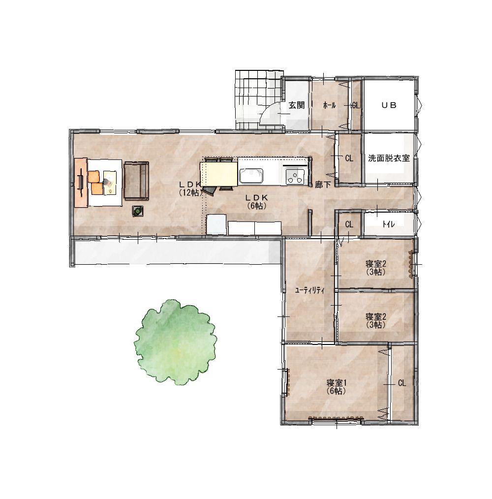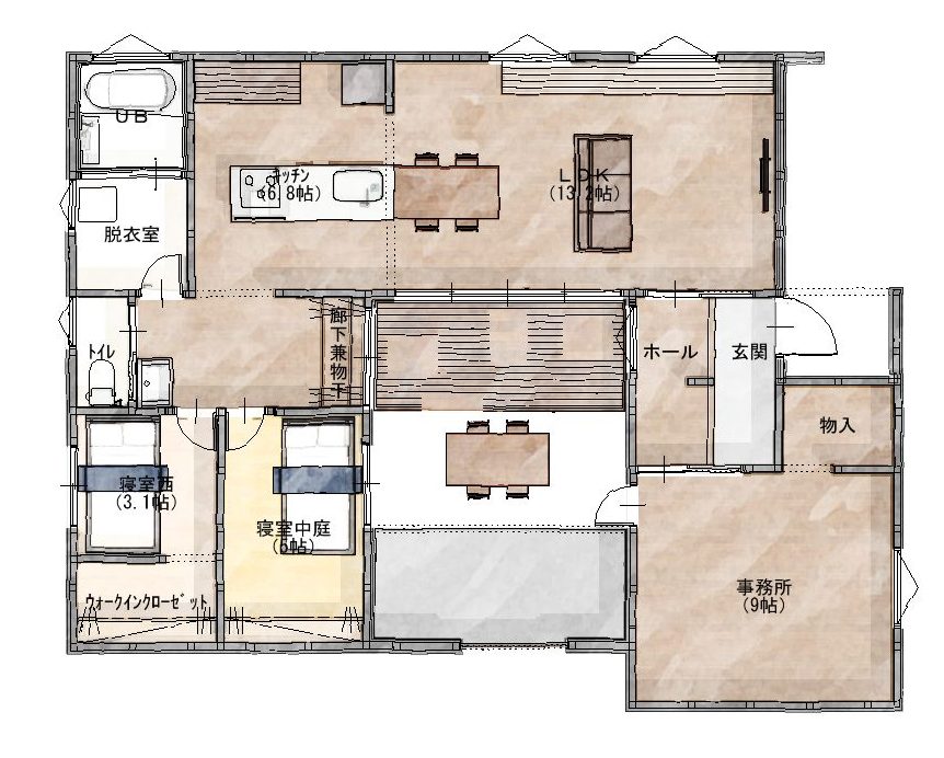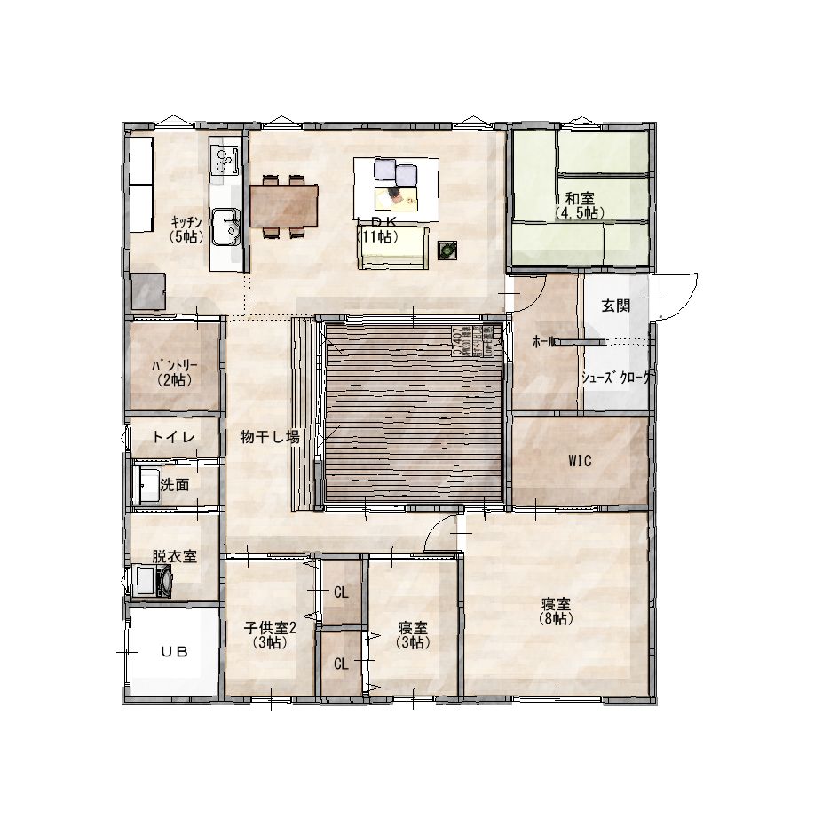 南面する中庭をコの字に部屋で囲んだプランです。デメリットは中庭を大きくすると家自体の面積が大きくなってしまう事と、採光を取りにくいことです。