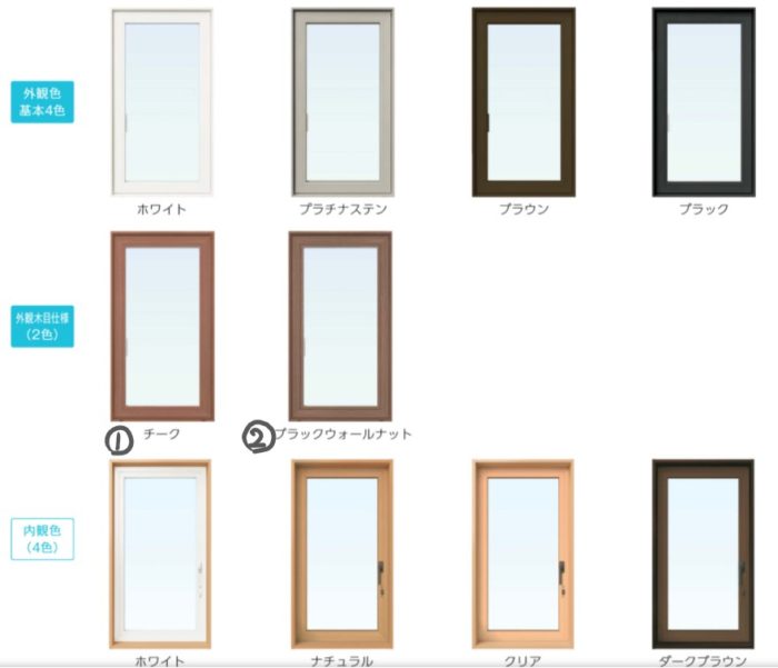 外観色6色、内観色4色から選べます。①②の外観色の場合サッシ代が1.25倍に上がります。内外ホワイトの場合5%サッシ代が下がります。
