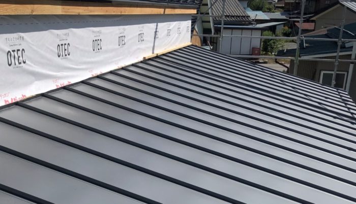 ガルバリウム鋼板をたて平葺きという工法で施工します。たて平葺きは雨漏りのリスクが少なく、緩い勾配にも対応しています。