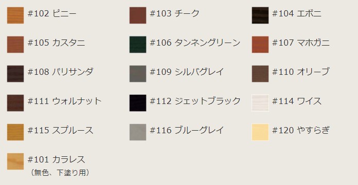 標準はヒノキ合板張りです。塗装色が選べます。濃い色の方が耐候性が高い傾向にあります。オリーブ、パリサンダ、ウォルナット、ジェットブラックがお勧めです。塗見本もありますのでお問合せください。